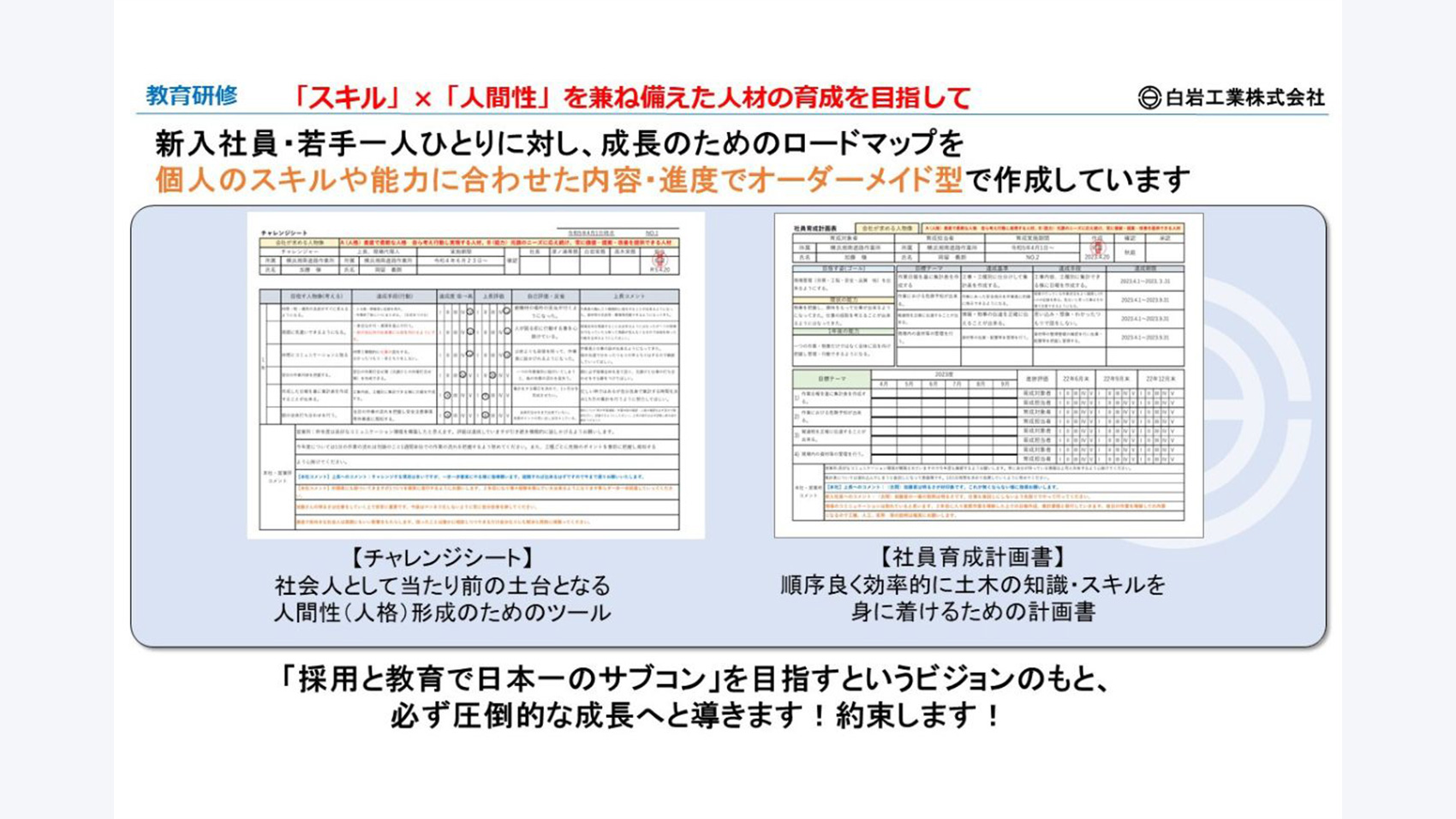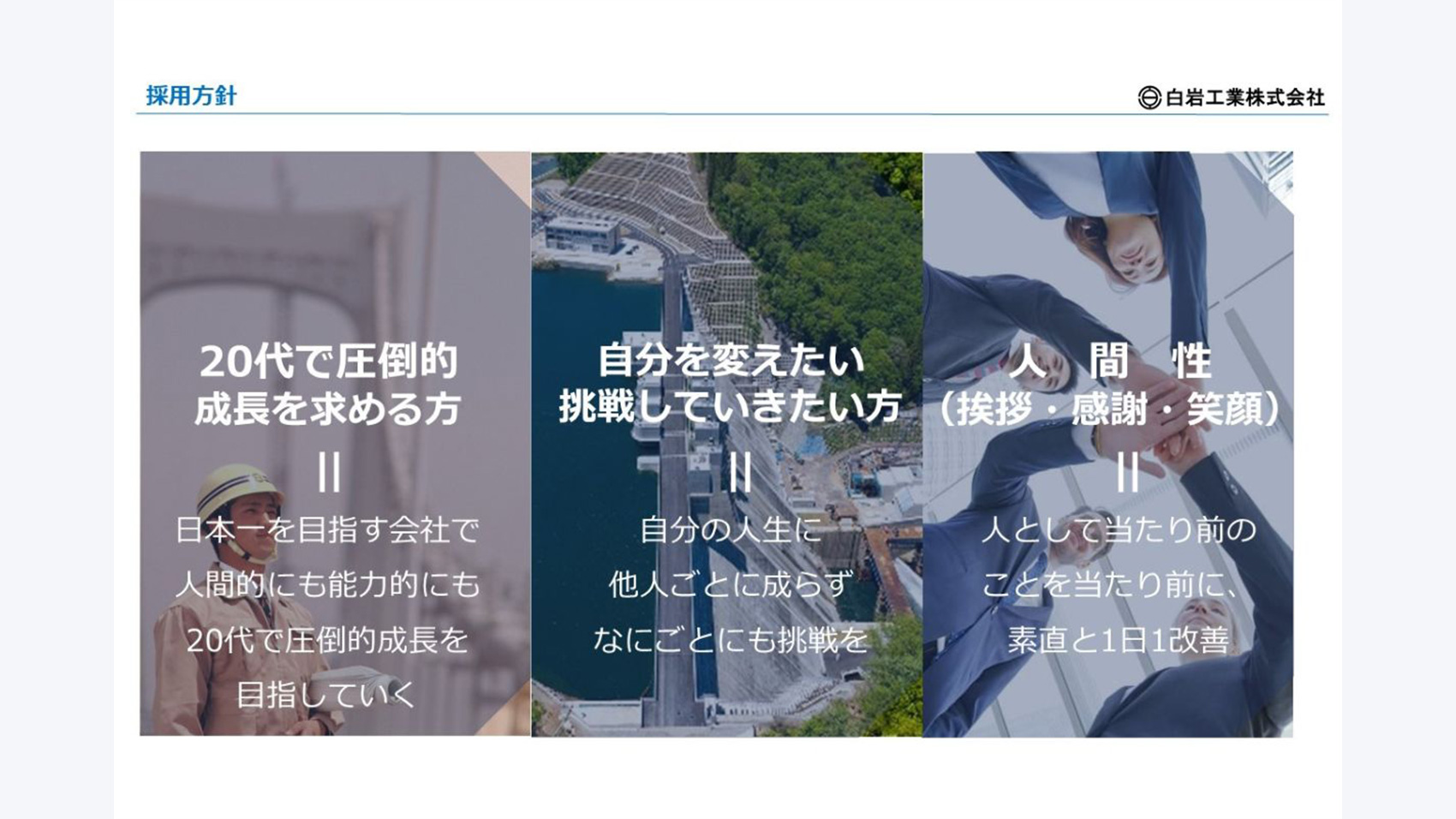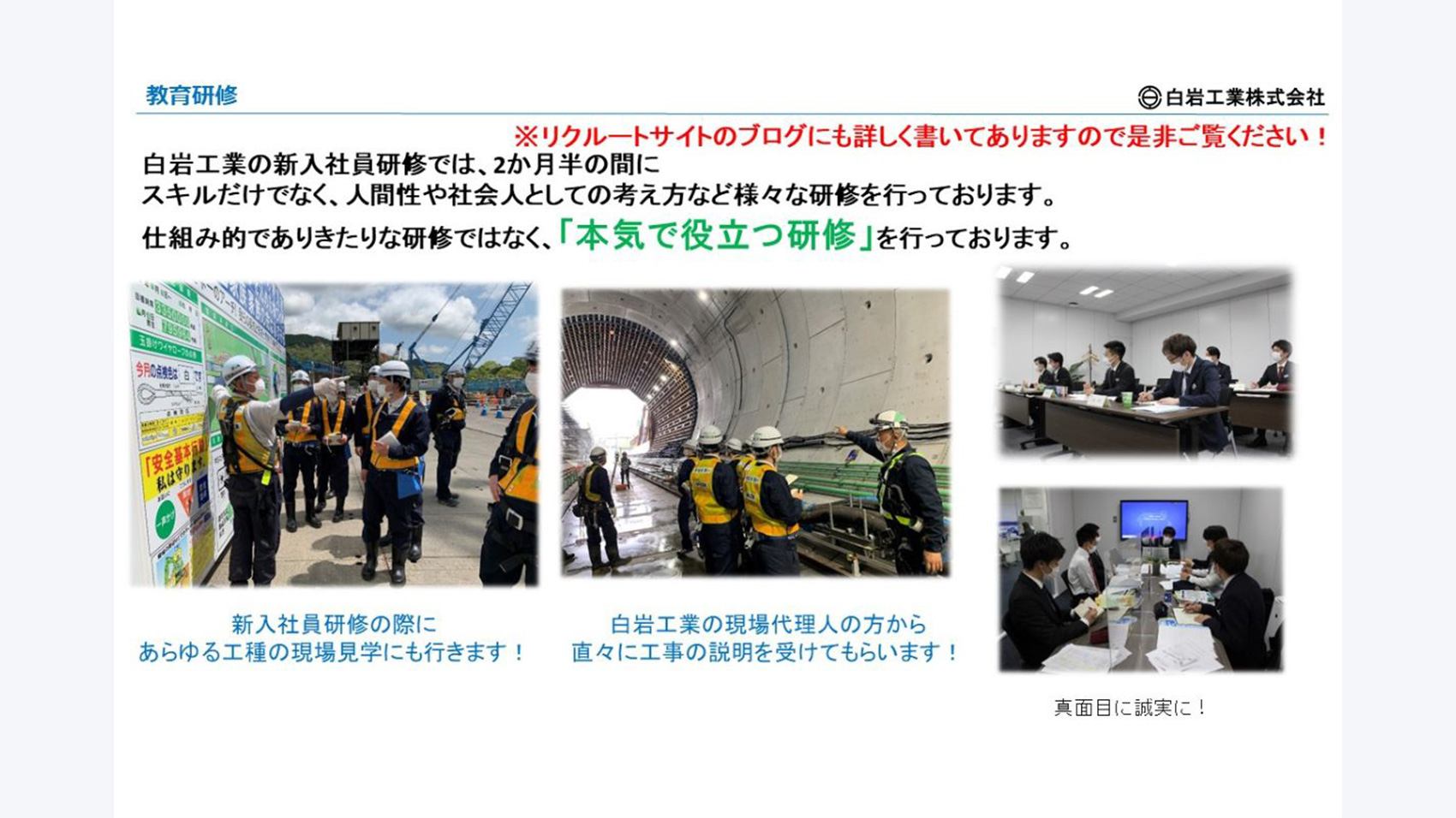 先にお話しした通り、白岩工業に入社した場合には必ず若手のうちから1人前の社会人・施工管理者として活躍できるように教育を行っていくことを約束します!そのためにも挑戦意欲、強い成長意欲、人間性のある方にはぜひ入社していただき一緒に頑張っていければと切に願っております。
