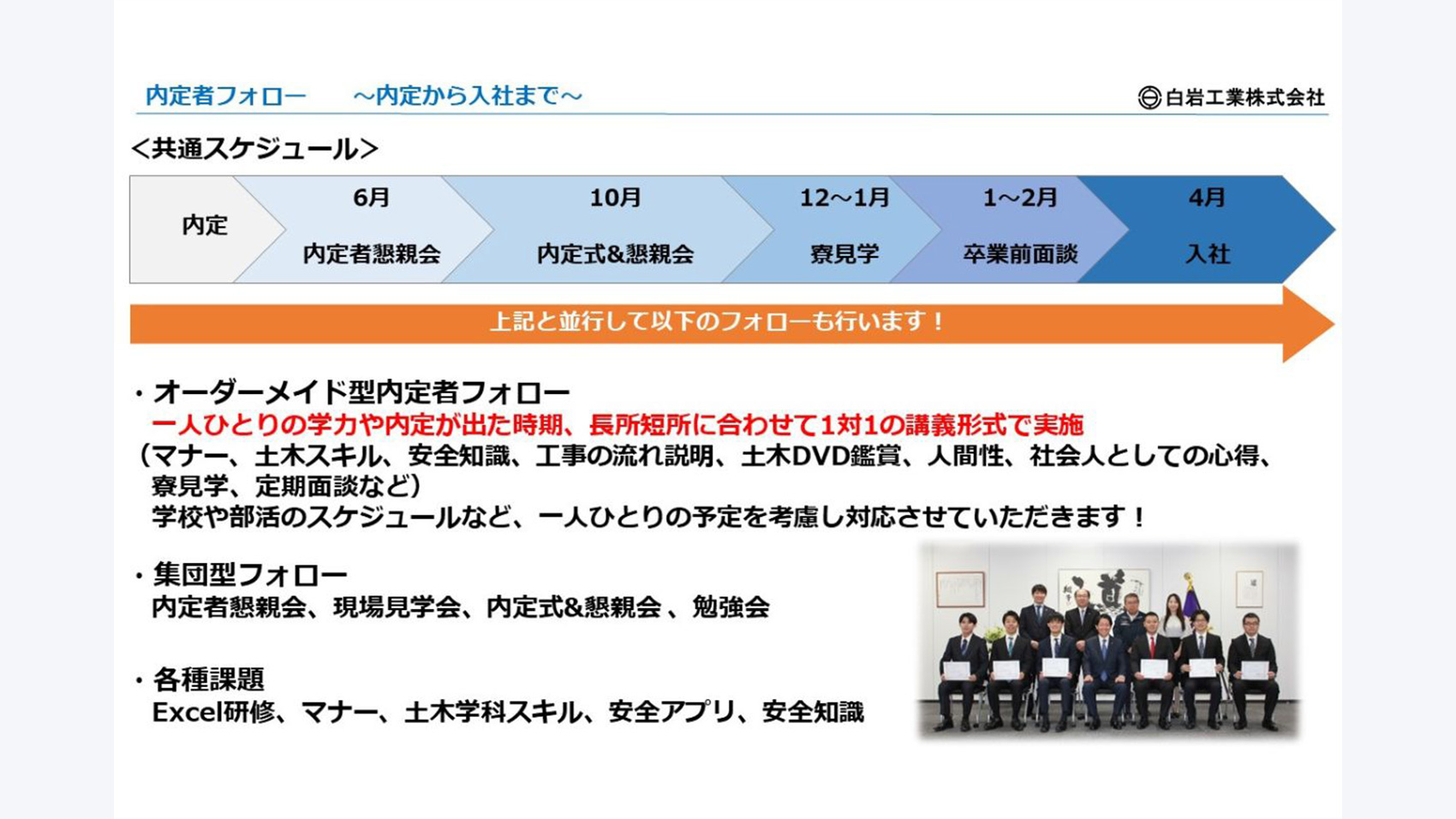 ですが、白岩工業では内定者フォローを「入社前教育」と位置付けており、内定者ひとりひとりに合わせて、ビジネスマナー、エクセルなどの社会人基礎となる部分から、専門知識、2級土木施工管理技士の学科取得、さらには採用担当者との定期的な個人面談など多岐にわたり実施しています。
