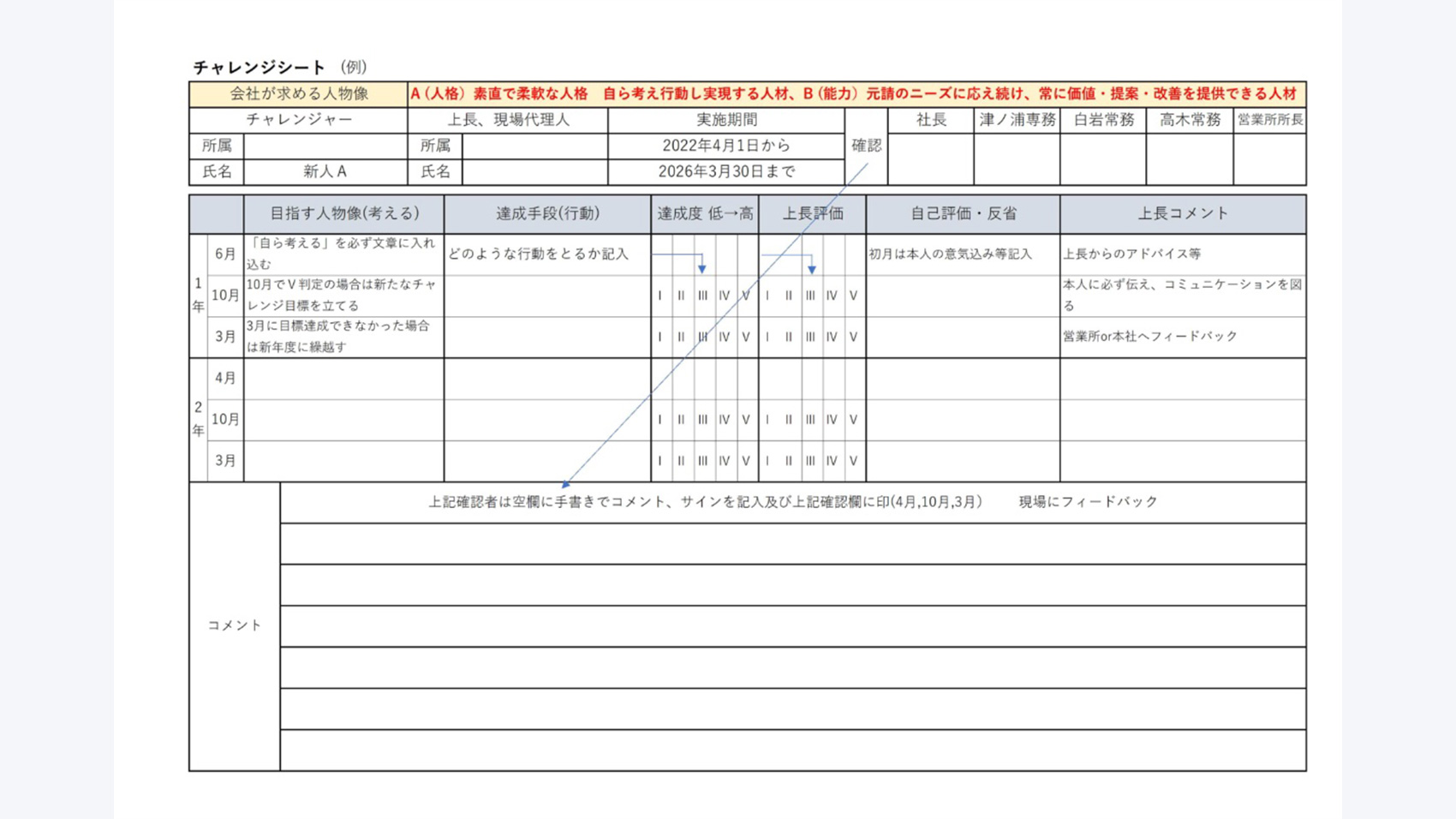 さて、「チャレンジシート」と「育成計画書」をざっくりと説明すると、チャレンジシートとは社会人として当たり前の土台となる人間性(人格)形成のためのツール、育成計画書は現場で必要となるスキルを順序良く効率的に身に着けるための計画書です。