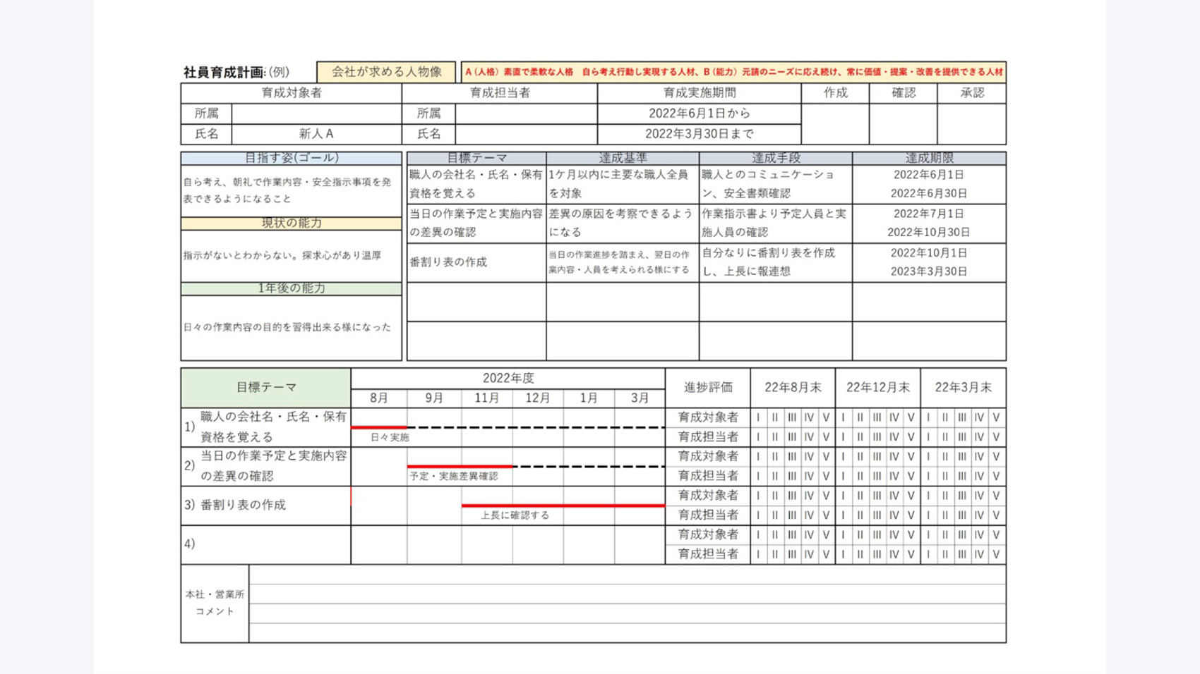 また、現場では必要となるスキルや土木の知識が沢山あるので順序良く効率的に身に着けていかなければなりません。鉄道工事や道路工事などといった工種によってその時に必要となるスキルも違うので上長(現場教育担当者)と本社、営業所が一体となって育成計画書を作成しています。
