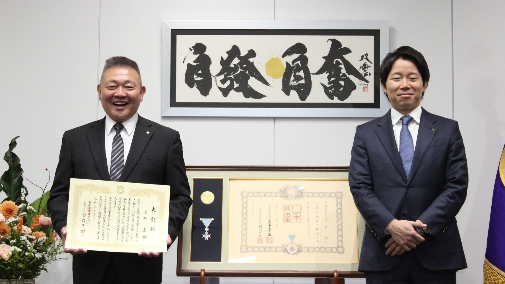 淺野課長は白岩工業入社前に、35年間自衛隊にて勤務しており、海外派遣も含め、自衛隊業務に尽力してきたことが評価され、受章の運びとなりました。
