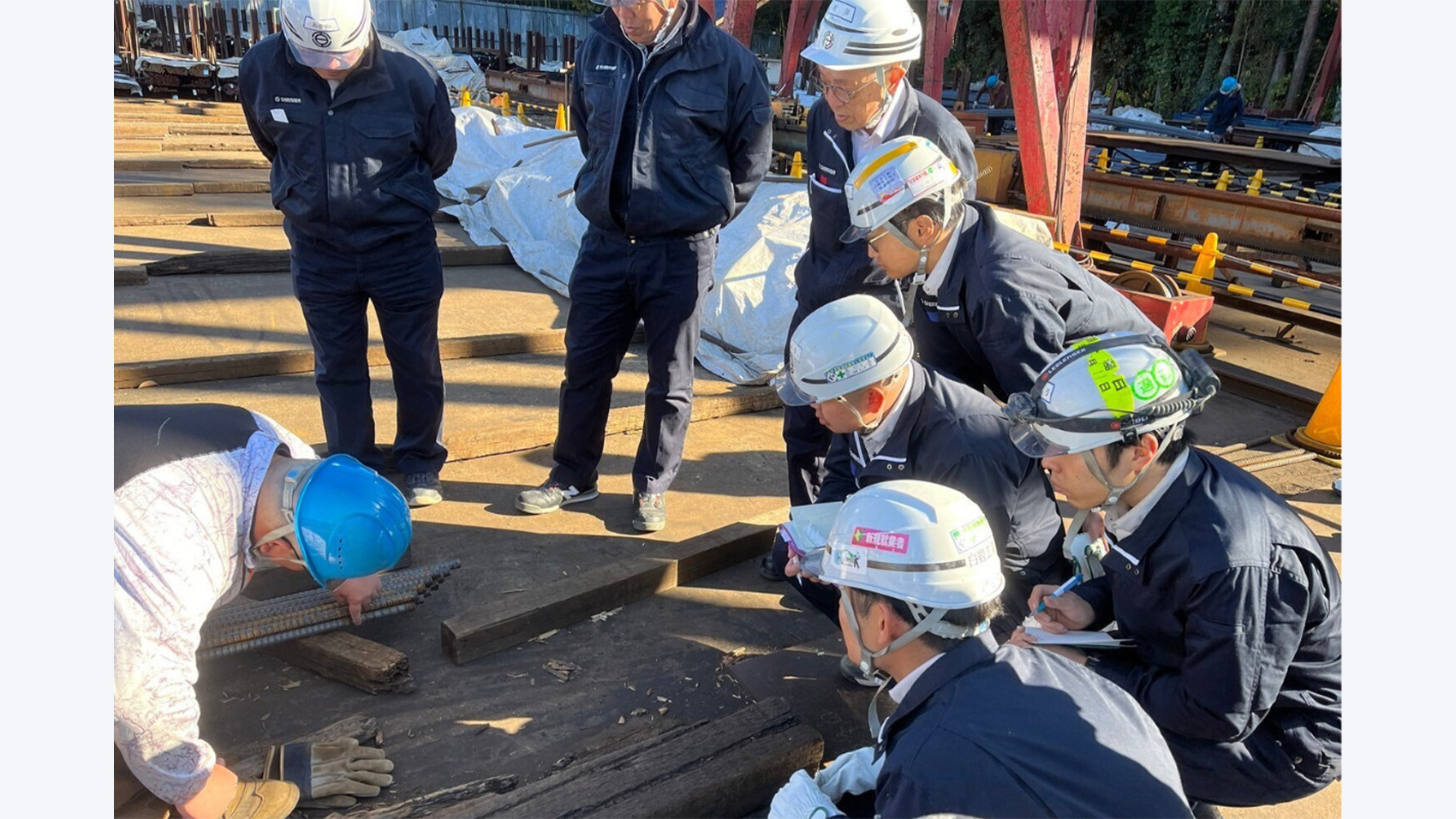 2日目には、当社の協力会社である株式会社岡本鉄筋様にて、鉄筋加工場の見学・実習を執り行っていただき、鉄筋資材の加工方法や寸法に関する知識など、日頃現場で目にする内容への理解を深める機会となりました。