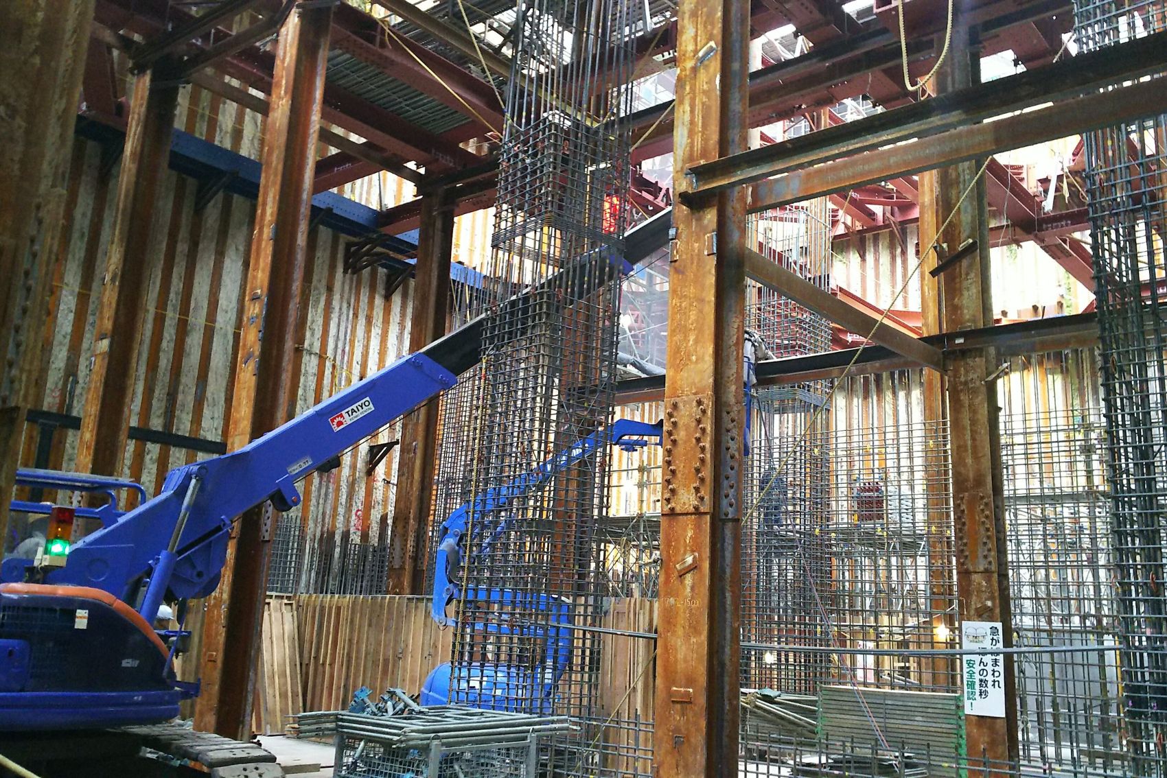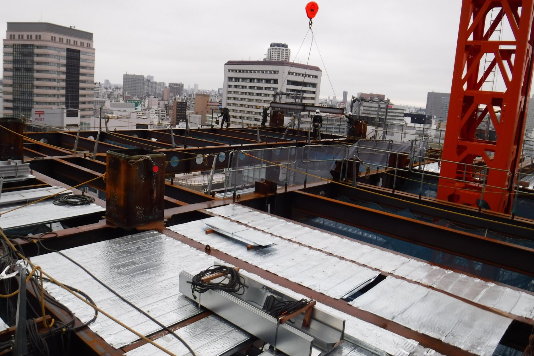 白岩工業は、現場代理人1名と協力会社約30名の体制で、地下3階・深さ19メートルの掘削工事から着手し、地上18階・高さ60メートルの鉄骨建方工事まで、掘削工事、コンクリート工事、仮設足場工事、鉄骨建方・仮設設備工事、タワークレーンおよび仮設EV工事、地下鉄接続工事など、多岐にわたる工種を担当しました。